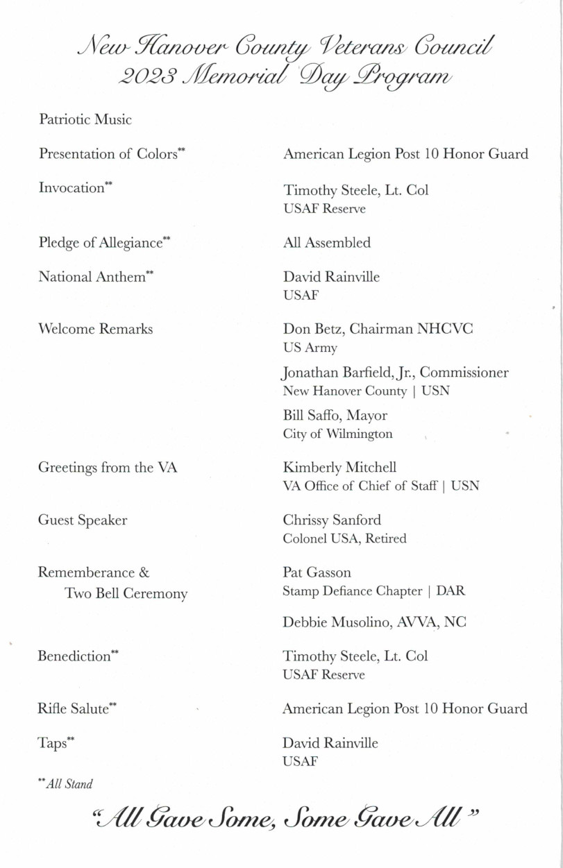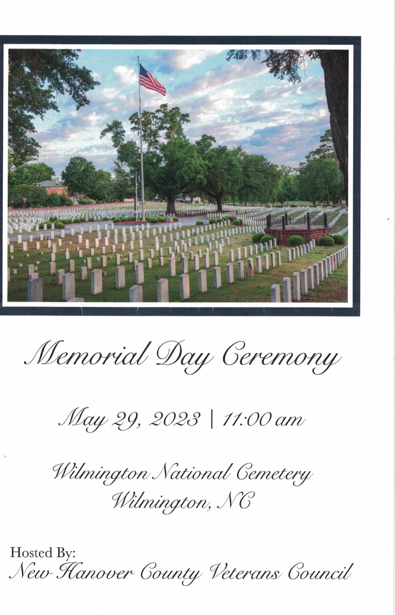 The Wilmington National Cemetery is the setting for the annual Memorial Day Ceremony sponsored by the New Hanover County Veterans Council. While the ceremony fits with the motto "Some Gave All, All Gave Some", the solemn part of the ceremony is the reading of the names of New Hanover County veterans that died in the past year. That number this year was around 550. The reading alone took 35 minutes!